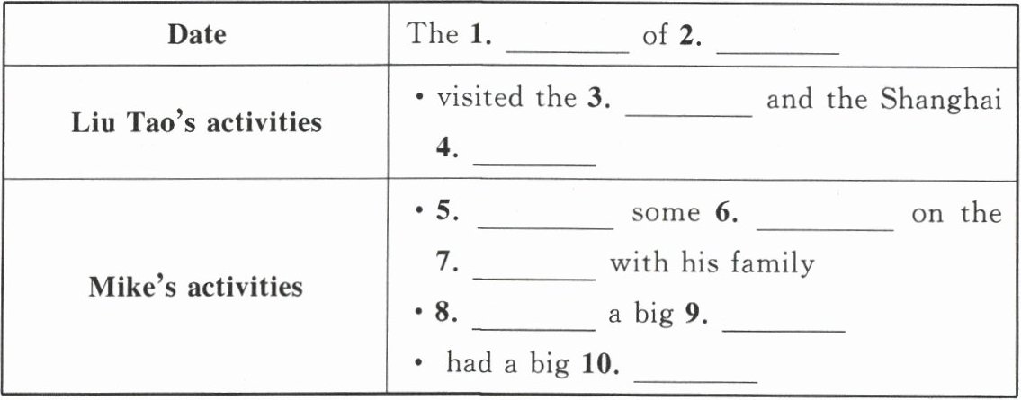 | Liu Tao's activities | · visited the 3.______ and the Shanghai 4.______ |