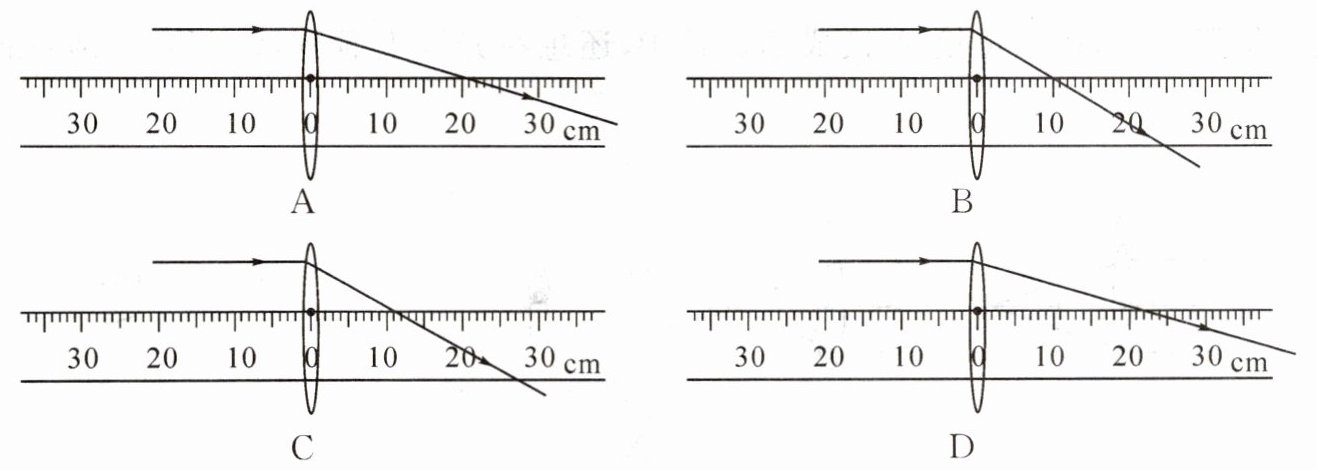6. (2022·广州白云区期末)烛焰距离凸透镜 20 cm,在透镜另一侧的光屏上成倒立、放大的像。小明画出一条光线经过此透镜的传播光路,如图所示。下列画法正确的是(