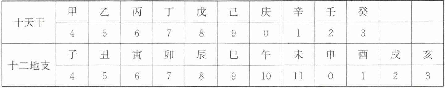 13. (2025 春·尤溪县期中)干支纪年是中国传统纪年方法.干支是天干和地支的总称,“甲、乙、丙…”等十个符号叫天干,“子、丑、寅…”等十二个符号叫地支,把干支(天干 + 地支)顺序相配(甲子、乙丑、丙寅…)正好六十为一周期,周而复始,循环纪律.有人总结出纪年算法的辅助表如下: