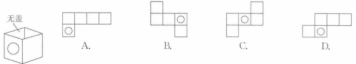 6. (2025·任丘市模拟)如图,嘉淇制作了一个无盖的正方体收纳盒,盒子的前面有一圆形标签,则此收纳盒的展开图是(