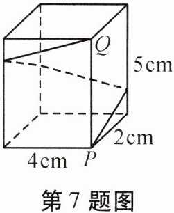 7. 如图,长方体的底面边长分别为2cm和4cm,高为5cm.若一只蚂蚁从点P开始经过4个侧面爬行一圈到达点Q,则蚂蚁爬行的最短路程为多少?画出侧面展开图,并解答.
