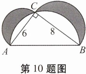 10. 如图,Rt△ABC 的两条直角边的长分别为 6 和 8,若以△ABC 三边的长为直径作半圆,则阴影部分的面积为