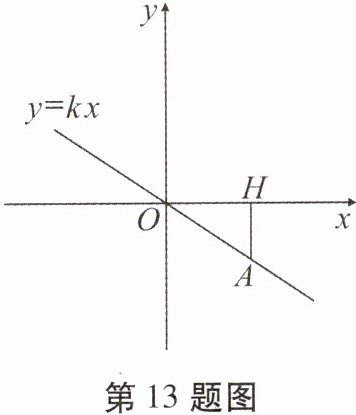 13. 如图,正比例函数 $ y = kx $ 的图象经过点 $ A $,点 $ A $ 在第四象限,过点 $ A $ 作 $ AH \perp x $ 轴,垂足为点 $ H $,点 $ A $ 的横坐标为 3,且 $ \triangle AOH $ 的面积为 3。