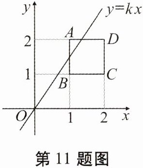 11. 将 $ 2 × 2 $ 的正方形网格如图放置在平面直角坐标系中,每个小正方形的顶点称为格点,每个小正方形的边长都是 1,正方形 $ ABCD $ 的顶点都在格点上。若直线 $ y = kx (k \neq 0) $ 与正方形 $ ABCD $ 有公共点,则 $ k $ 的取值范围是