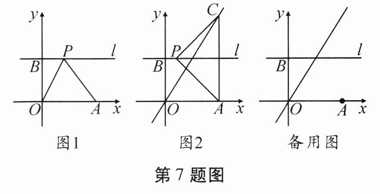 7. 如图,平面直角坐标系中,已知点 $ A(10,0) $,点 $ B(0,8) $,过点 $ B $ 作 $ x $ 轴的平行线 $ l $,点 $ P $ 是直线 $ l $ 上位于第一象限内的一个动点,连接 $ OP $,$ AP $。