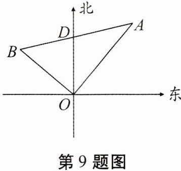 9. 如图,一艘轮船以16海里/时的速度离开港口,向北偏东40°方向航行,同时另一艘轮船以12海里/时的速度向北偏西一定角度的方向航行,已知它们离港口一个半小时后相距30海里(即AB= 30海里),问另一艘轮船航行的方向是北偏西多少度?