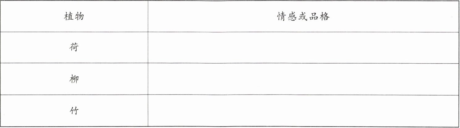 丁香常被用来表达“忧愁和思念”的情感,许多文人墨客都喜欢借助植物来抒发情感,表达自己对某种品格的追求。请查阅资料,将下面的表格补充完整吧!