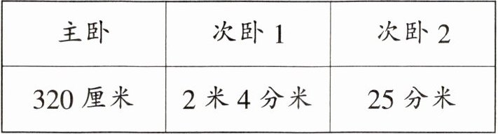 4. 1 米 8 分米=18 分米 40 厘米=4 分米 18+4+4=26(分米) 320 厘米=32 分米 2 米 4 分米=24 分米,32>26,所以可以放主卧。