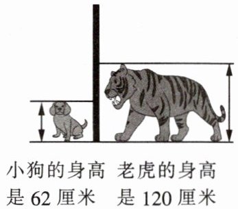 2. 确定位置:木桩上已知小狗身高62厘米,老虎身高120厘米,骆驼身高180厘米高于老虎身高,在老虎身高刻度上方合适位置标注“△”。