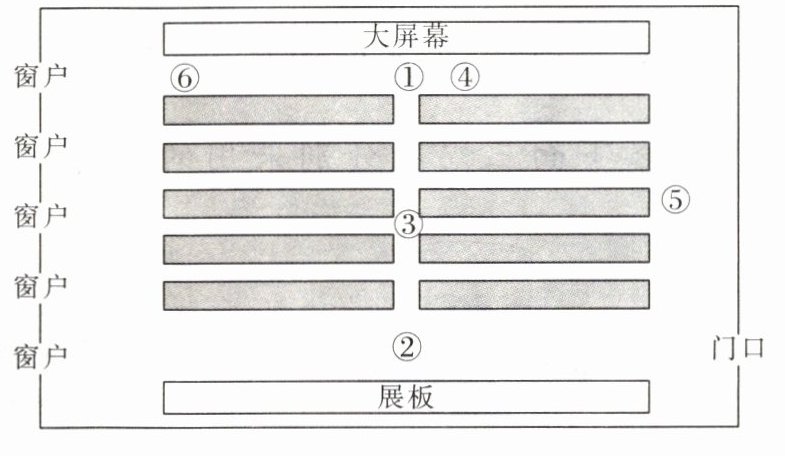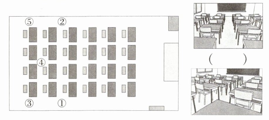 3. 右图中左边是淘气所在班级的教室平面图,右边的2张照片分别是在哪个位置拍摄的?填上对应的序号。