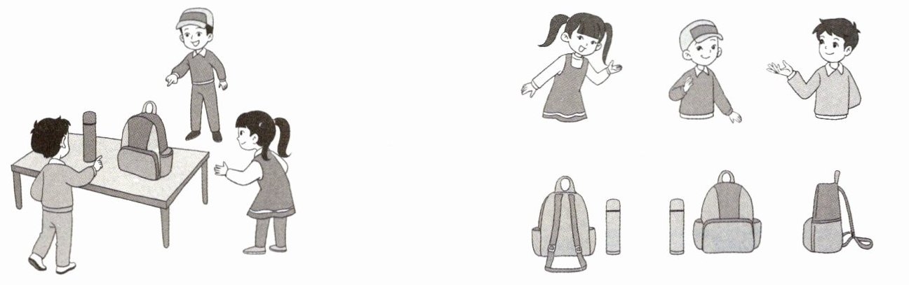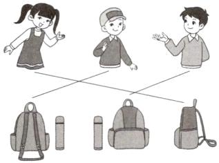 1. 桌子上放着书包和水杯。右面几幅图分别是谁看到的?连一连。