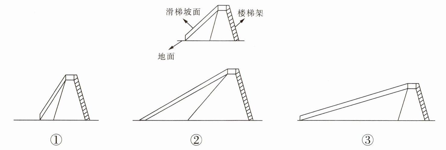 2. 某小区物业公司计划为园区安装儿童滑梯,设计公司提供了以下三种类型的滑梯(如下图)。要选择合适的滑梯,需要观察滑梯坡面与地面所组成的夹角。从安全性和趣味性考虑,选择(