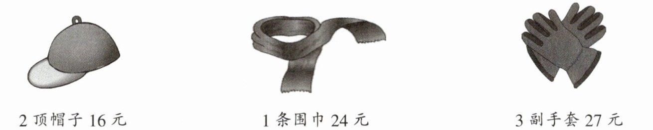 (1)24-16÷2=16(元) (2)24+27÷3=33(元) (3)1条围巾比1副手套贵多少元?