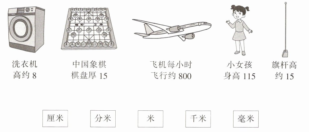 洗衣机高约8分米,中国象棋棋盘厚15毫米,飞机每小时飞行约800千米,小女孩身高115厘米,旗杆高约15米。