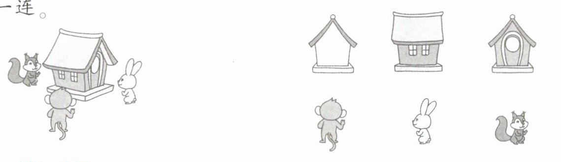 3. 松鼠、小猴、小兔站在不同的位置观察房子,它们各看到哪一幅图?请你用线连一连。