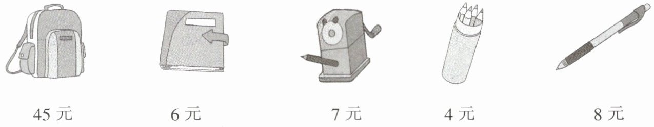 书包:45元4×6 + 45 = 69(元)(2)50 - 6×7 = 8(元) (3)答案不唯一。例如:买1个书包和8盒彩笔共需要多少元?买6支笔付了100元,应找回多少元?