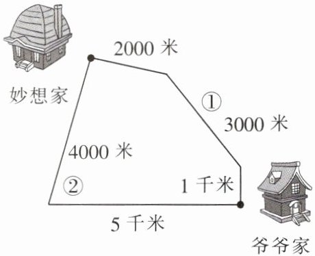 (1)路线①:2000米=2千米 3000米=3千米 2+3+1=6(千米) 路线②:4000米=4千米 4+5=9(千米) 6千米<9千米,路线①更近 9-6=3(千米) 3千米=3000米 答:妙想从路线①走更近,能少走3000米。(2)答案根据个人的步行时间而不同。参考答案:如果步行1千米需要15分钟的话,路线①6千米需要90分钟。