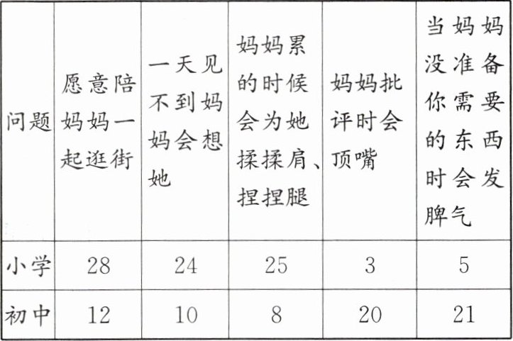 (1)【提取信息】母爱是世界最真挚的爱,它孕育并护卫着我们的生命;母爱如阳光,让我们的世界充满温暖、充满希望。在此次活动中,班级对学校不同年级的学生做了一次调查,请仔细阅读下面表格,谈谈你的发现。