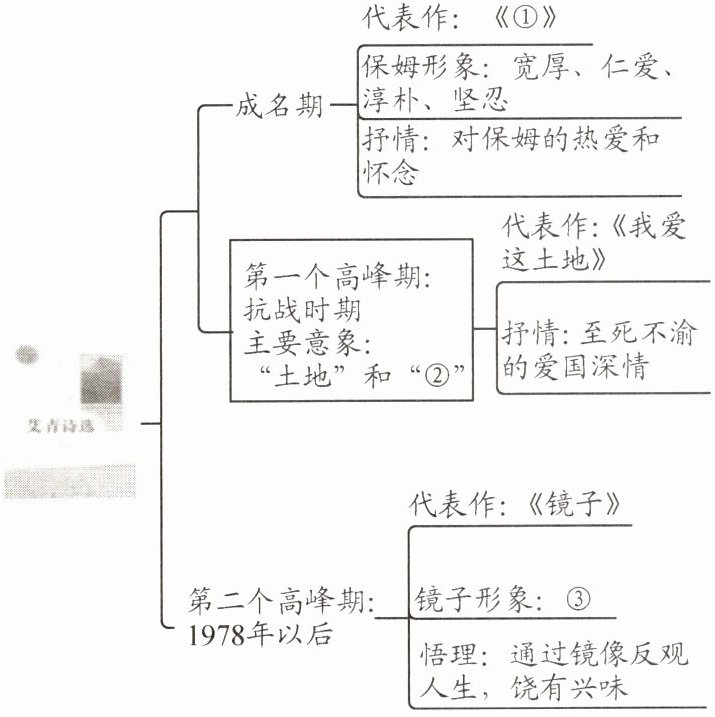 16. 同学品读了《艾青诗选》,并用思维导图向大家推荐艾青写诗的三个时期的代表作品,请你帮忙完善内容。