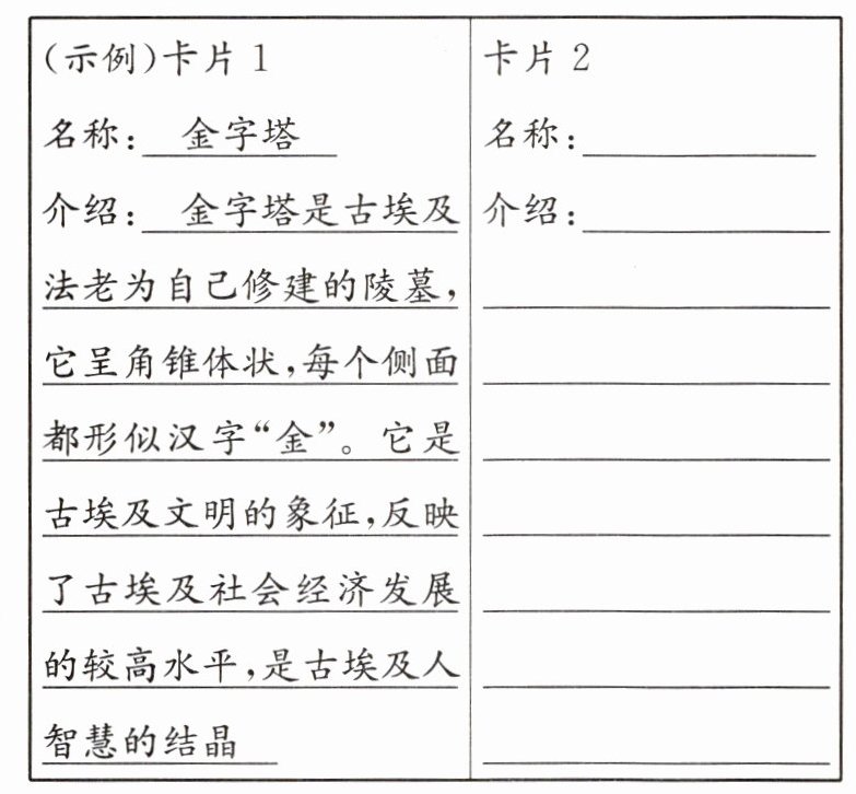 (2)二组同学根据一组同学搜集的图片,准备制作相关文明成果的宣传卡片。请你仿照卡片1的示例,帮他们将卡片2中的内容补充完整。