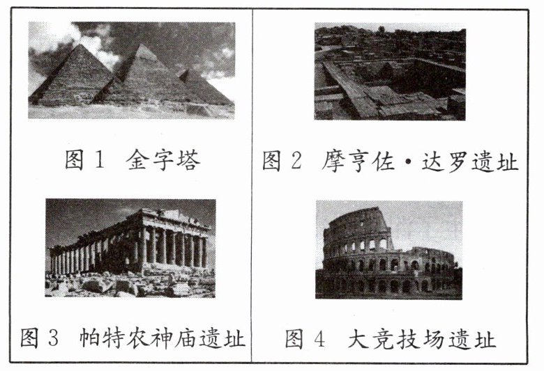 (1)一组同学搜集了以上图片资料,请你将各图片所代表的文明类型进行分类,并简要说明理由。