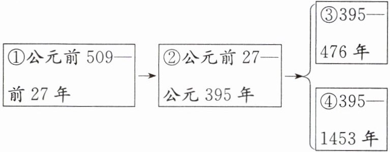 D 【解析】根据所学知识可知,4世纪末,罗马帝国分裂为东西两个帝国。东罗马帝国又称拜占庭帝国;1453年,拜占庭帝国被奥斯曼帝国所灭。故④处政权的名称是拜占庭帝国,D项符合题意。