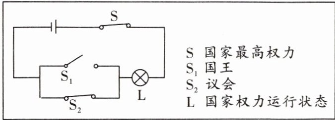 9.B 【解析】本题涉及物理的跨学科知识。这是一幅并联电路示意图,当代表国家最高权力的S处开关处于闭合状态时,代表国王的S₁处开关被断开,表示电流无法正常通过;代表议会的S₂处开关处于闭合状态,电流可以正常通过S₂处,并使代表国家权力运行状态的指示灯L亮起。据此可知,该国的国家最高权力由议会行使,国王并不参与实际的政治生活。这是英国君主立宪制的典型特征,故B项正确。