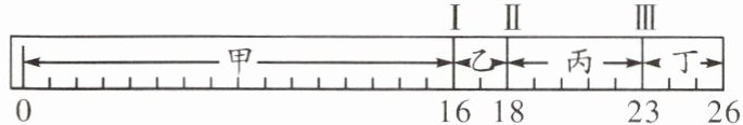 16. 密闭容器中有甲、乙、丙、丁四种物质,反应前各物质的质量关系如图中刻度纸所示(例如丙的质量为$5 g$,丁的质量为$3 g$)。充分反应后,在同一张刻度纸上记录各物质的质量变化:刻度线Ⅰ向左移动$16$格;刻度线Ⅱ向左移动$8$格;刻度线Ⅲ向左移动$8$格。下列说法正确的是(