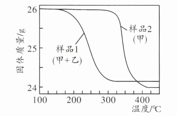 13. (2025·福建泉州·期末考试)分别加热等质量的两种样品,固体质量随温度变化的曲线如图所示。样品1反应前后各物质的质量如下表所示。分离出样品1反应后的固体乙,再与$24.0 g$甲混合并加热,固体质量变化曲线与样品1的相同。下列说法不正确的是(