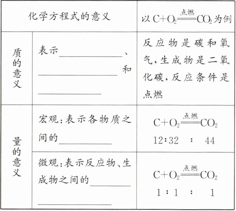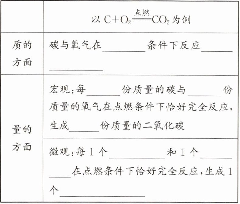 |$\mathrm{C}+\mathrm{O}_{2}\xlongequal{点燃}\mathrm{CO}_{2}$反应物是碳和氧气,生成物是二氧化碳,反应条件是点燃||量的意义|宏观:表示各物质之间的