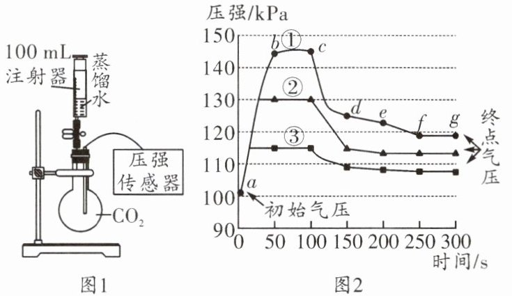 6. (2025·江苏宿迁·期末考试)某小组利用图1所示装置研究25℃时二氧化碳的溶解性。打开弹簧夹,向3个充满二氧化碳的100mL烧瓶中分别注入20mL、40mL、60mL蒸馏水,关闭弹簧夹,振荡。振荡前后瓶内压强的变化如图2所示。下列说法不正确的是(