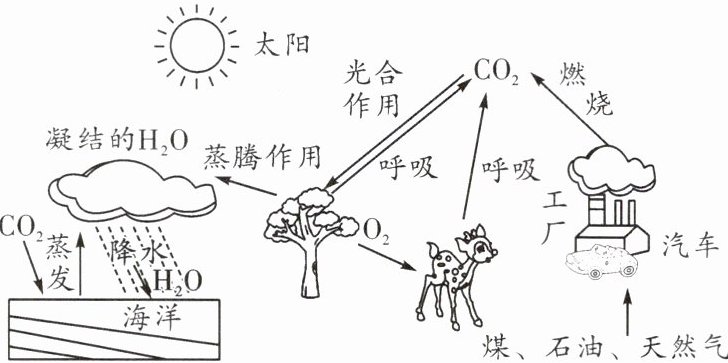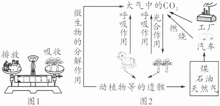 (1)人和动植物的呼吸、化石燃料的燃烧都能产生$CO_2$。近几十年来,大气中$CO_2$含量增多的主要原因是化石燃料的大量使用和绿色植物被大量砍伐。