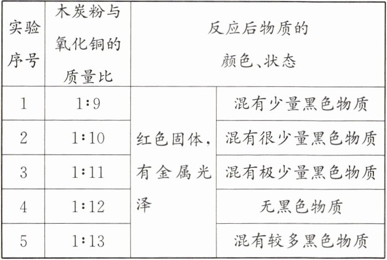 (5)木炭粉与氧化铜的最佳质量比为1:12;1:13时氧化铜已过量,1:14会更过量,无实验必要