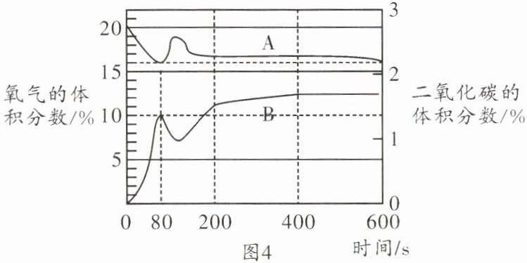 。丁同学使用传感器测得密闭装置内从蜡烛燃烧到其熄灭后的过程中氧气和二氧化碳含量的变化曲线$,$如图$4$所示。图$4$中代表氧气含量变化的曲线是A