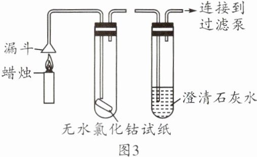 (填一个物理性质和一个化学性质$)。$蜡烛燃烧时会冒黑烟$,$干扰对实验现象的观察。乙同学对该实验进行了改进:利用过滤泵使蜡烛的燃烧产物依次通过无水氯化钴试纸和澄清石灰水$,$如图$3$所示。实验中蓝色的无水氯化钴试纸变红色$,$说明有水
