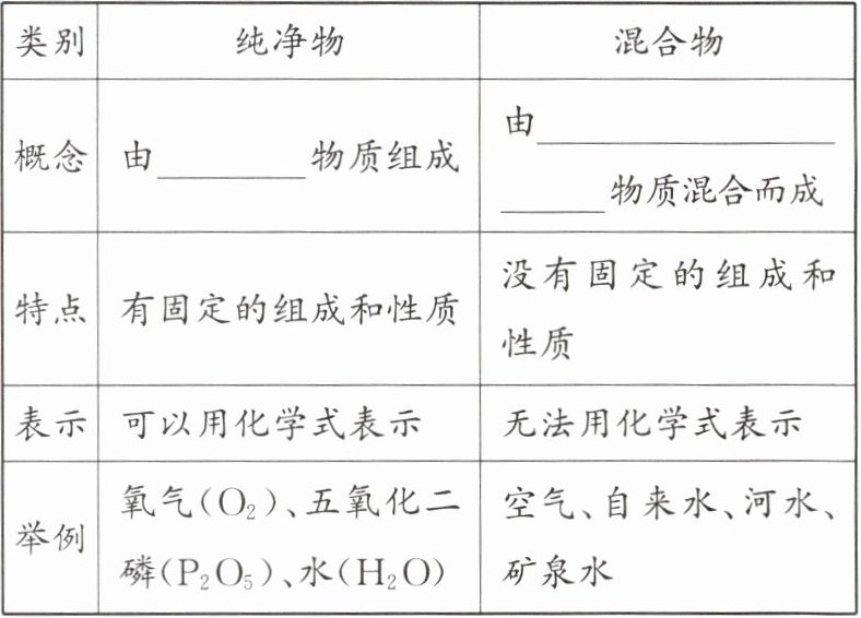 |举例|氧气($O_2$)、五氧化二磷($P_2O_5$)、水($H_2O$)|空气、自来水、河水、矿泉水|