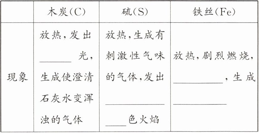 光,生成使澄清石灰水变浑浊的气体 | 放热,生成有刺激性气味的气体,发出蓝紫