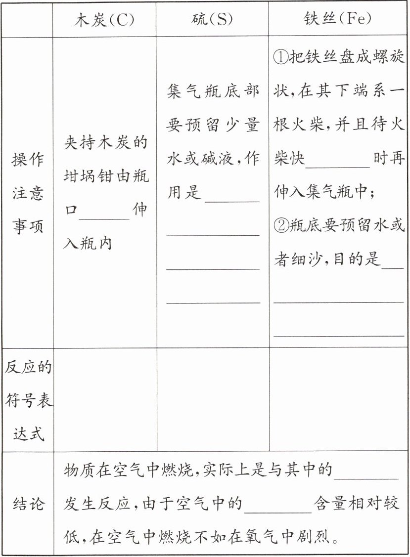 | 操作注意事项 | 缓慢 | 吸收二氧化硫,防止污染空气 | 燃尽;防止高温熔融物溅落炸裂瓶底 |