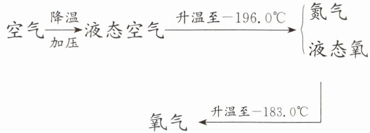 空气$\xrightarrow[加压]{降温}液态空气\xrightarrow{升温至 - 196.0^{\circ}C}\left\{\begin{array}{l}氮气\\ 液态氧\end{array} \right.$