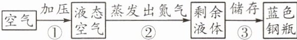空气$\xrightarrow[①]{加压}液态空气\xrightarrow[②]{蒸发出氮气}剩余液体\xrightarrow[③]{储存}$蓝色钢瓶