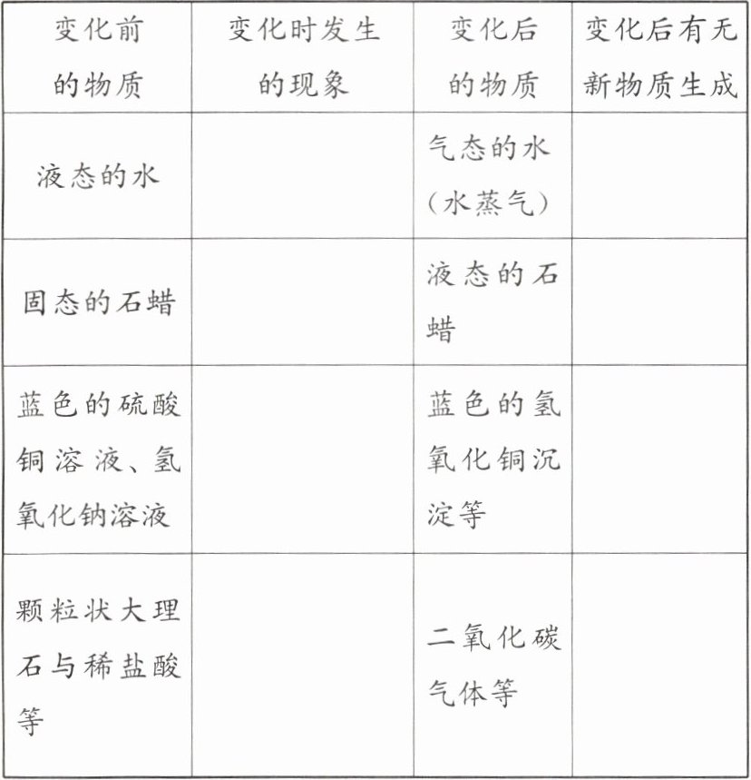 |变化前的物质|变化时发生的现象|变化后的物质|变化后有无新物质生成|
