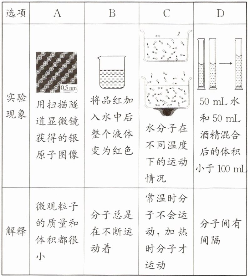 |实验现象|用扫描隧道显微镜获得的银原子图像|将品红加入水中后整个液体变为红色|水分子在不同温度下的运动情况|50 mL 水和 50 mL 酒精混合后的体积小于 100 mL|