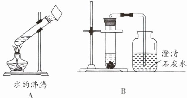 (2)装置B:①将一块大理石用锤子砸成小块,放入试管中;②向试管中倒入少量稀盐酸,可观察到大理石表面有气泡冒出,大理石逐渐减少;③试剂瓶中的澄清石灰水变浑浊。上述实验过程中,属于物理变化的是