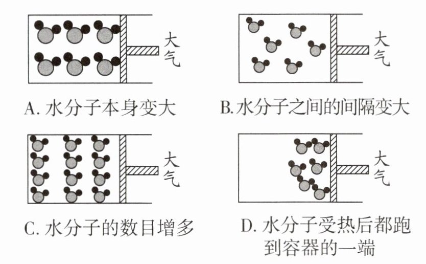 2. 下图表示封闭在某容器中的少量液态水的微观示意图(该容器的活塞可以左右移动)。煮沸后,液态水变成水蒸气,在这个过程中发生的变化是(