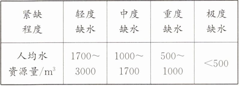 |人均水资源量$/m^3$|1700~3000|1000~1700|500~1000|<500|