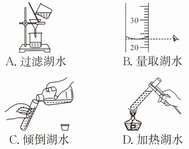1. (2025·安徽安庆·期末考试)花亭湖是国家4A级旅游景区,曾承办多项国际性游泳赛事。某校化学兴趣小组的同学为了检测湖水的品质,取适量湖水进行实验。下列操作正确的是(