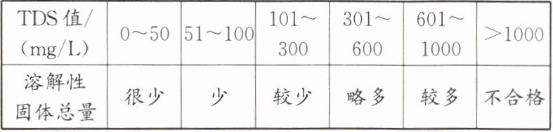 |TDS 值/(mg/L)|0~50|51~100|101~300|301~600|601~1000|>1000|