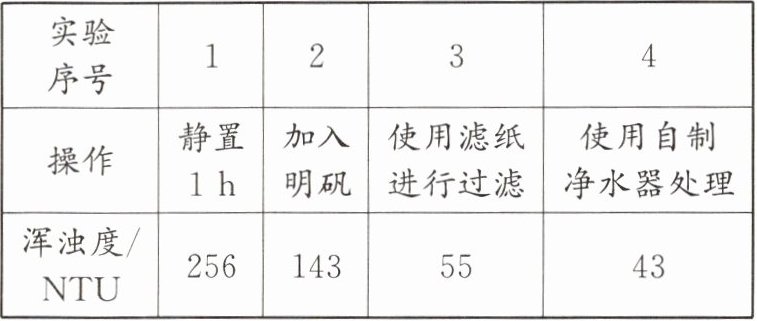 ②实验3使用滤纸过滤后浑浊度为55NTU,实验4使用自制净水器处理后浑浊度为43NTU,43<55