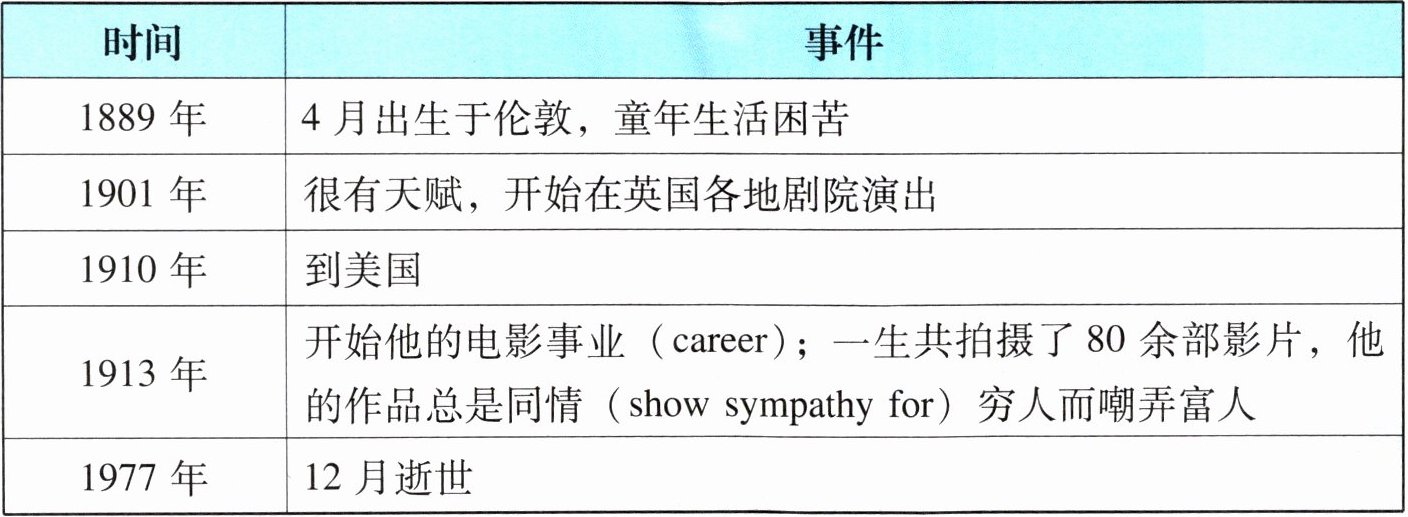 He was born in London in April 1889. He led a hard life during his childhood but he was a gifted boy. At the age of 12, he began to perform at different theatres across Britain. In 1910, he went to the USA and started his film career there in 1913. He made more than 80 films in his life. And his works always show sympathy for the poor and make fun of the rich. Charlie Chaplin died in December 1977.
