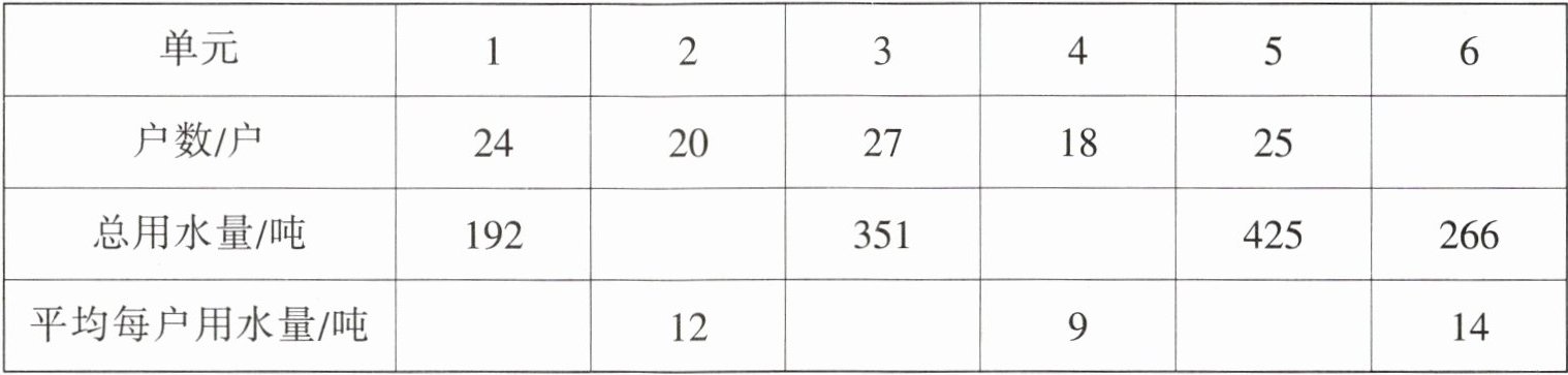 3. 小林家的小区有 6 个单元的居民楼,下面是这座居民楼的住户十月份的用水情况统计表。请把统计表补充完整。